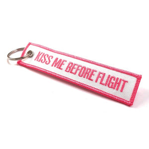 Gorgeous Kiss Me Before Fight white and funky pink luggage tag will add colour and character to every luggage or travel bag. Made from the finest quality polyester. Beautifully embroidered with the words KISS ME BEFORE FLIGHT in fluorescent pink text . This awesome keychain was inspired by the classic aviation term Remove Before Flight and designed to raise a smile from everyone.