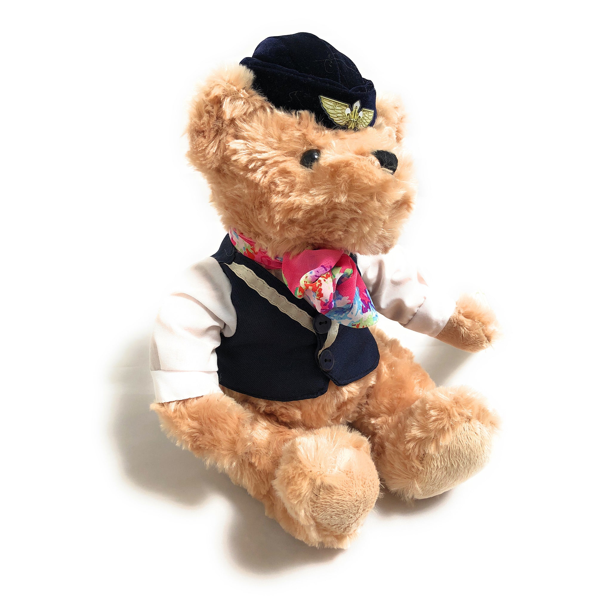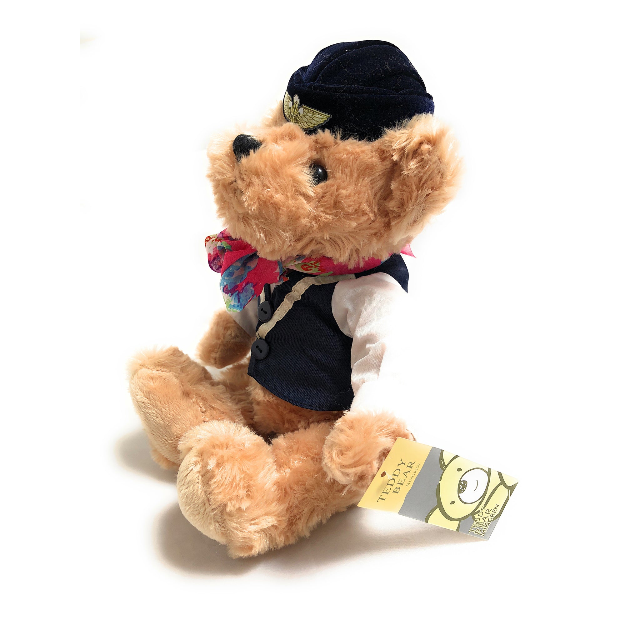 This adorable Flight Attendant Small Teddy Bear would make a fabulous gift for girls and boys who love airplanes, travelling, and collecting soft toys. Beautifully made from the finest quality fabrics, she measures 25 cm tall in the sitting position, and she is dressed to impress in a gorgeous blue uniform and beautiful floral scarf and flight attendant hat.